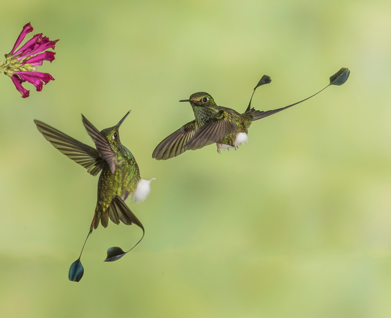 Two male booted racket-tail hummingbirds assume aggressive positions over first rights to a flower.