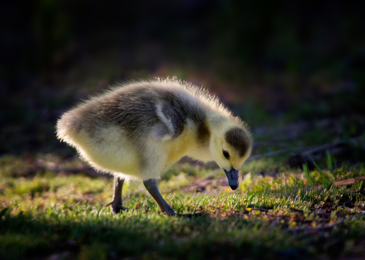 A little gosling that walked ashore, I had to wait for it to get into the light which made a nice backlit effect.