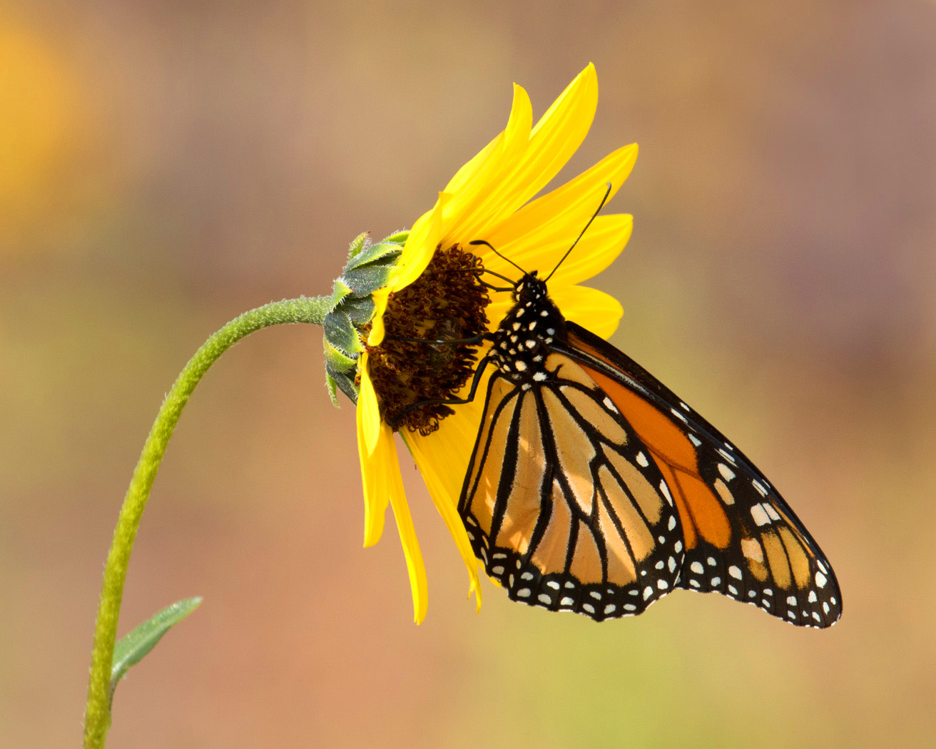Monarch butterfly on sunflower during fall migration at Eads, Colorado