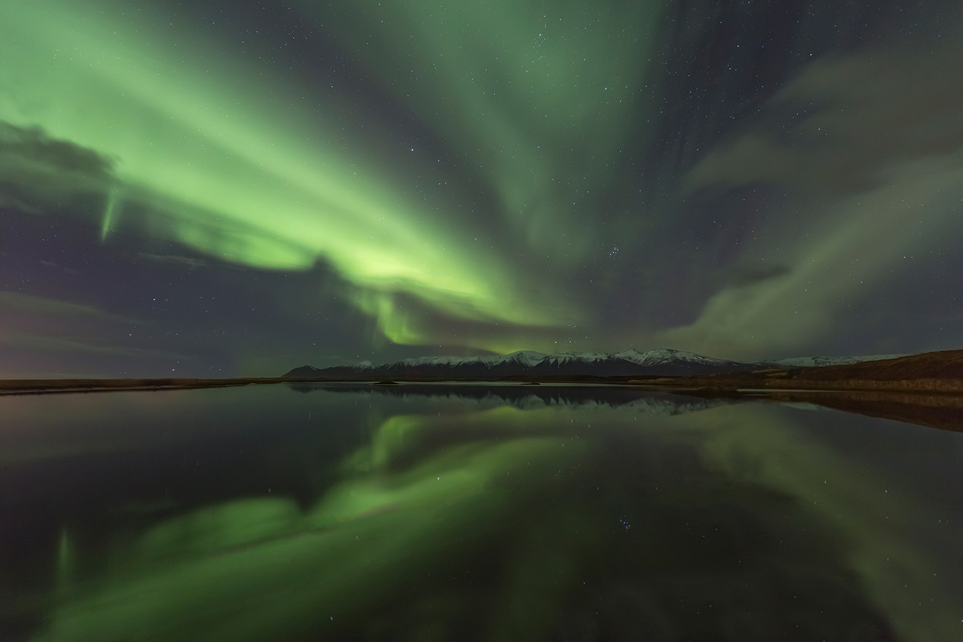 The Aurora Borealis also called the Northern Lights is reflected in a fjord as the vivid lights undulate and seem to explode from the mountain peaks in Dalvik, Iceland.