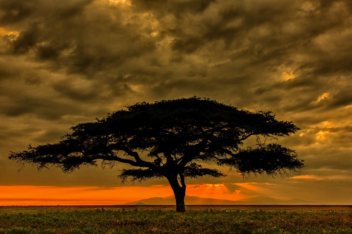 Acacia tree silhouetted against storm clouds at sunset