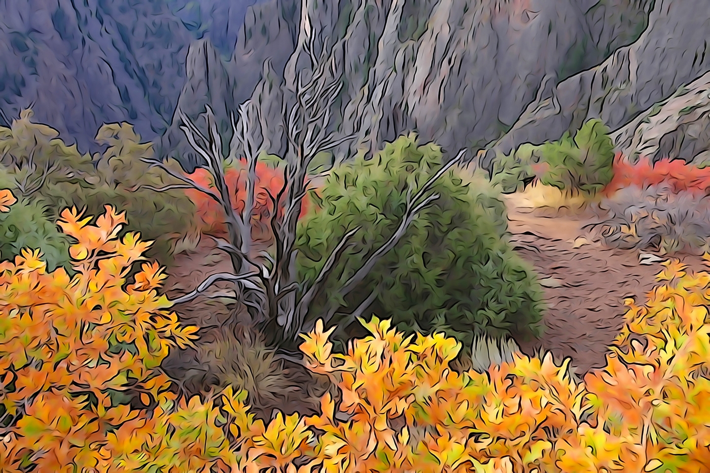Fall foliage display at the canyon. A watercolor effect was added in post-processing.