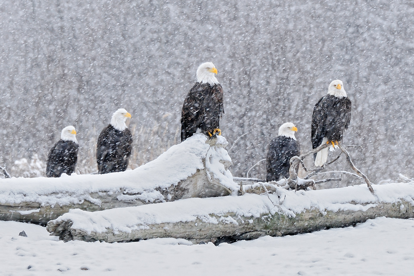 These five eagles weather a snow storm with perfect dignity and grace. The birds of prey often have to endure snow in the northern climates where they thrive.