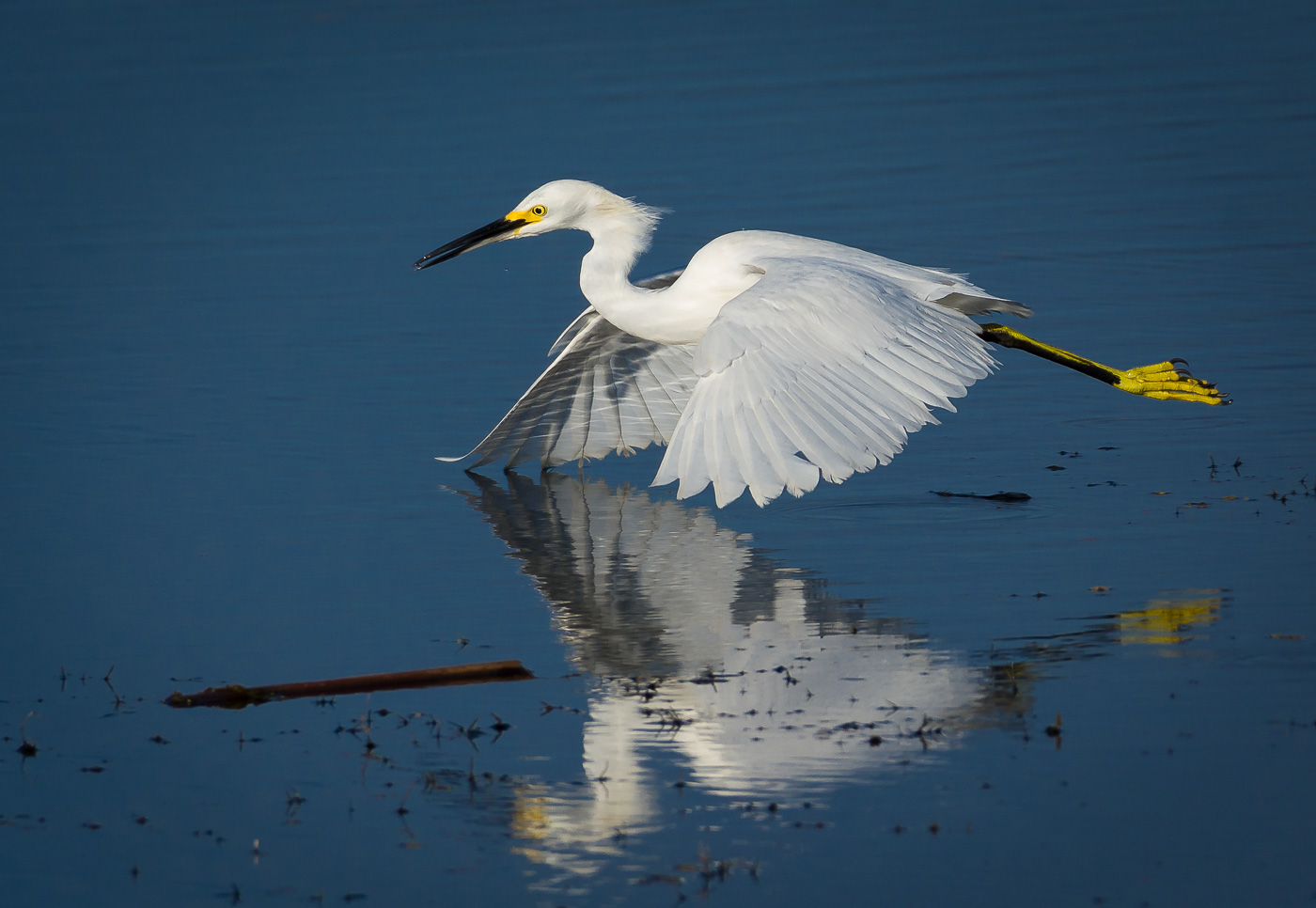 A Snowy Egret cruises close to the surface of the lake