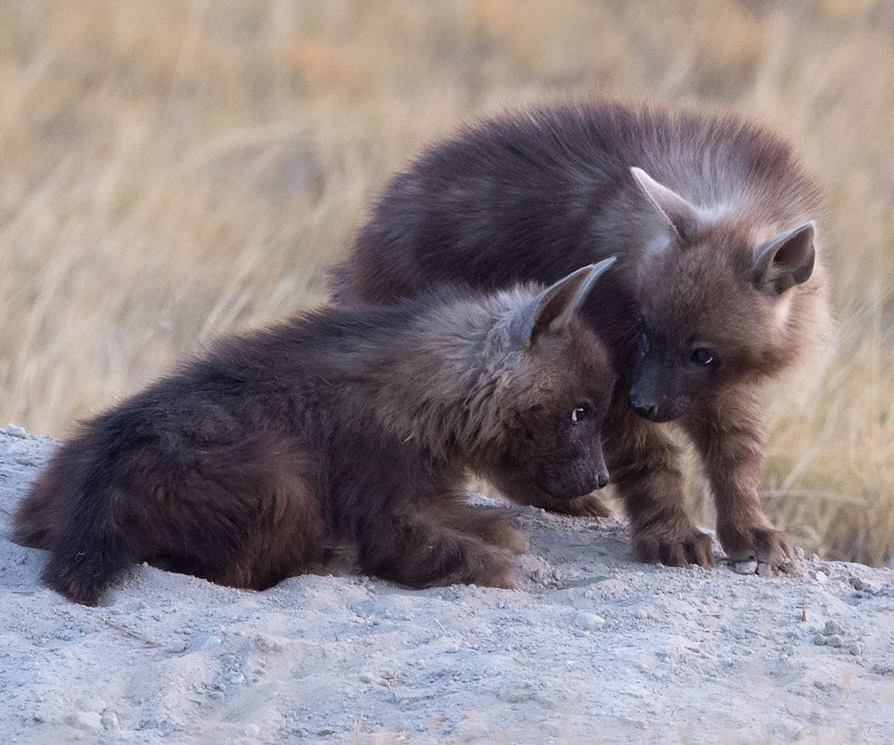 The light was very low as it was almost dark when the three Brown hyena cubs came scampering out of their den to look for their mom. She came shortly after and nursed all three, it was another magical moment for me.