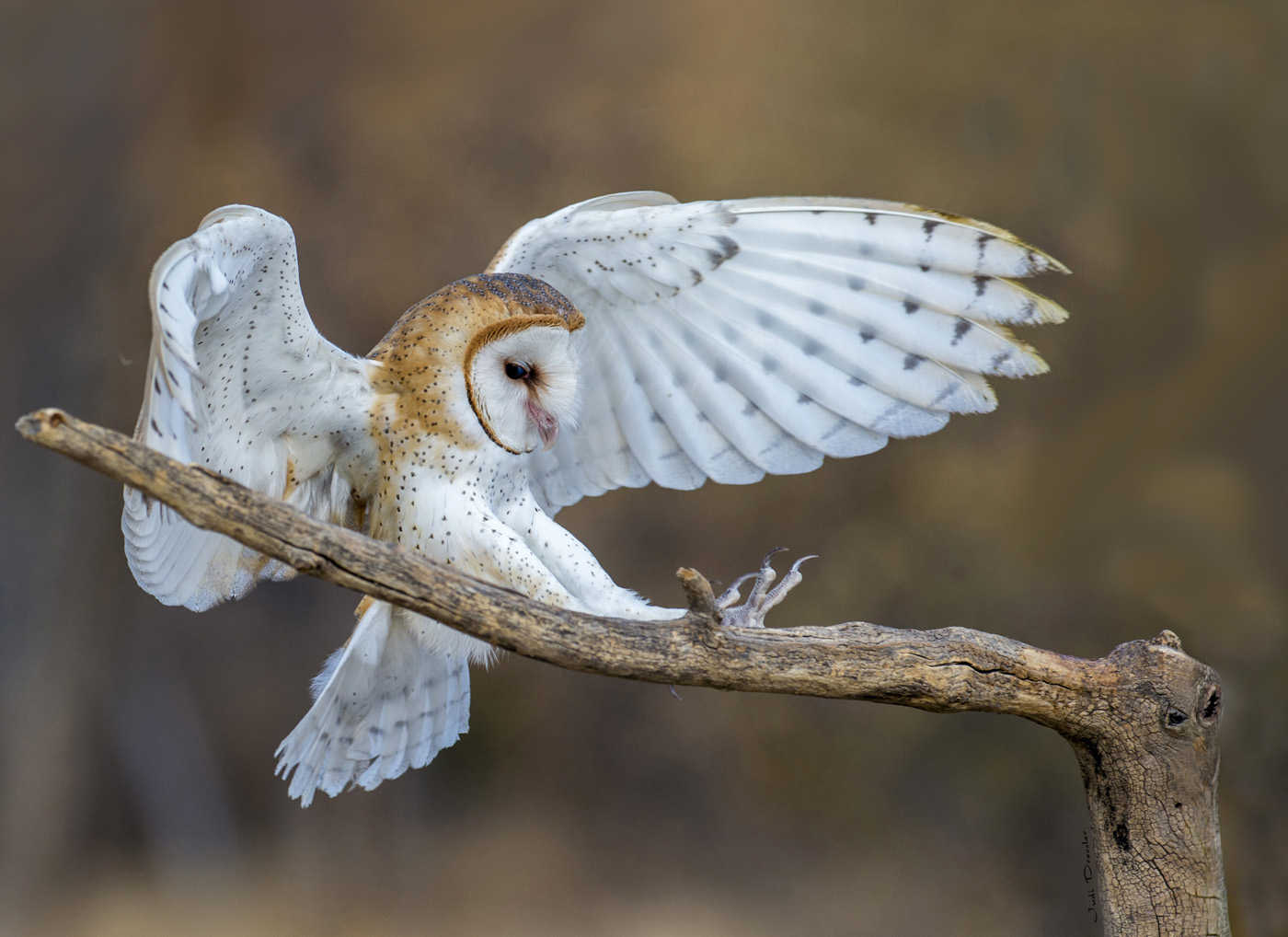 Cupid, the Barn Owl just about to grab the branch during a "Birds in Flight" raptor workshop given by Rob Palmer in 2016.