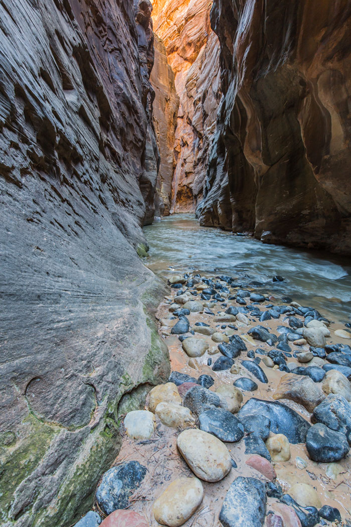 Walls, rocks and rapids converge to a shaft of sunlight in the Narrows Canyon of Zion National Park, Utah.