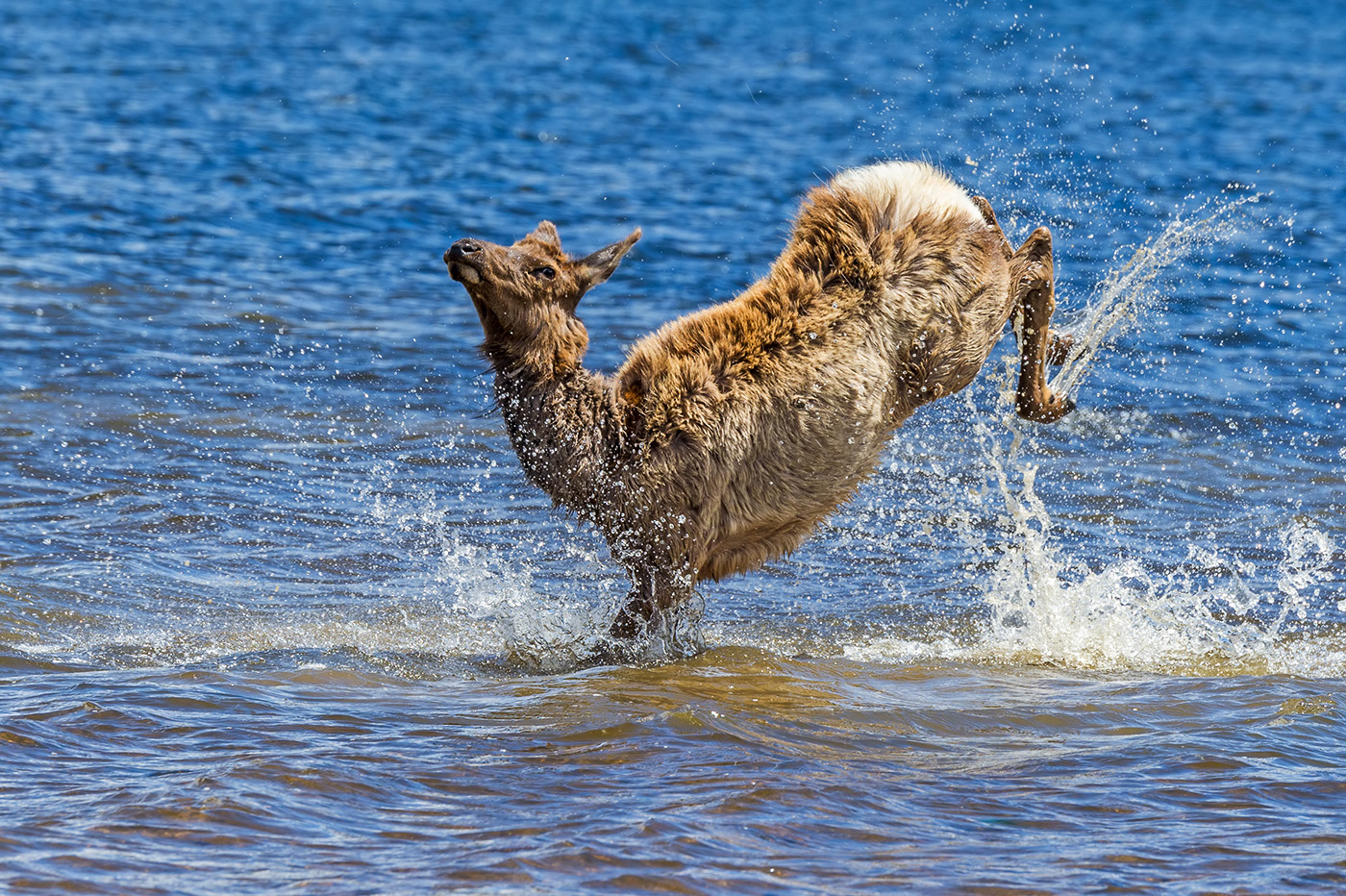 A yearling elk decides to enjoy a nice spring day by splashing around in Lake Estes in Estes Park, Colorado
