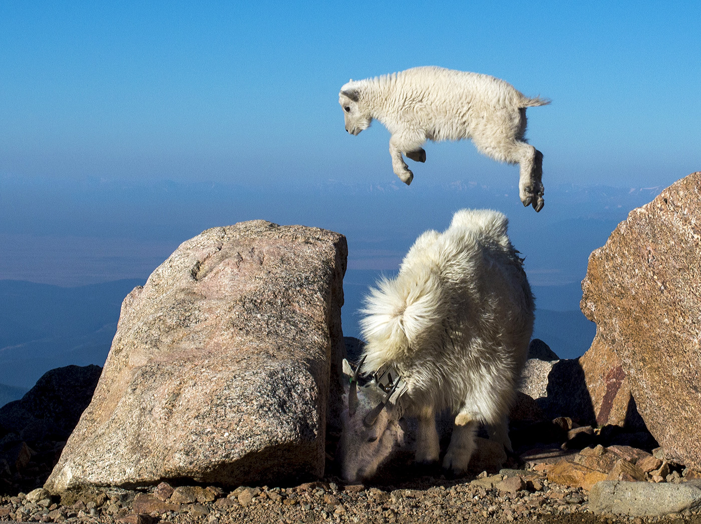 Early morning shot of a frisky Mountain Goat baby leaping over mom, with white-capped peaks barely visible in the background.