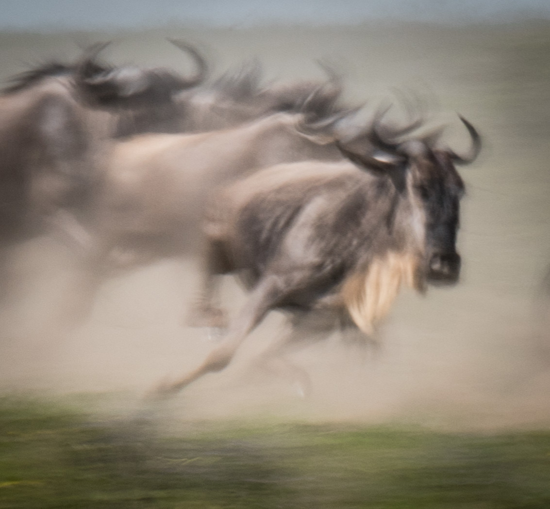 Something spooked them, and a previously orderly migration of uncountable wildebeest erupted in a frenzy. Here is a close-up of some of the pack.