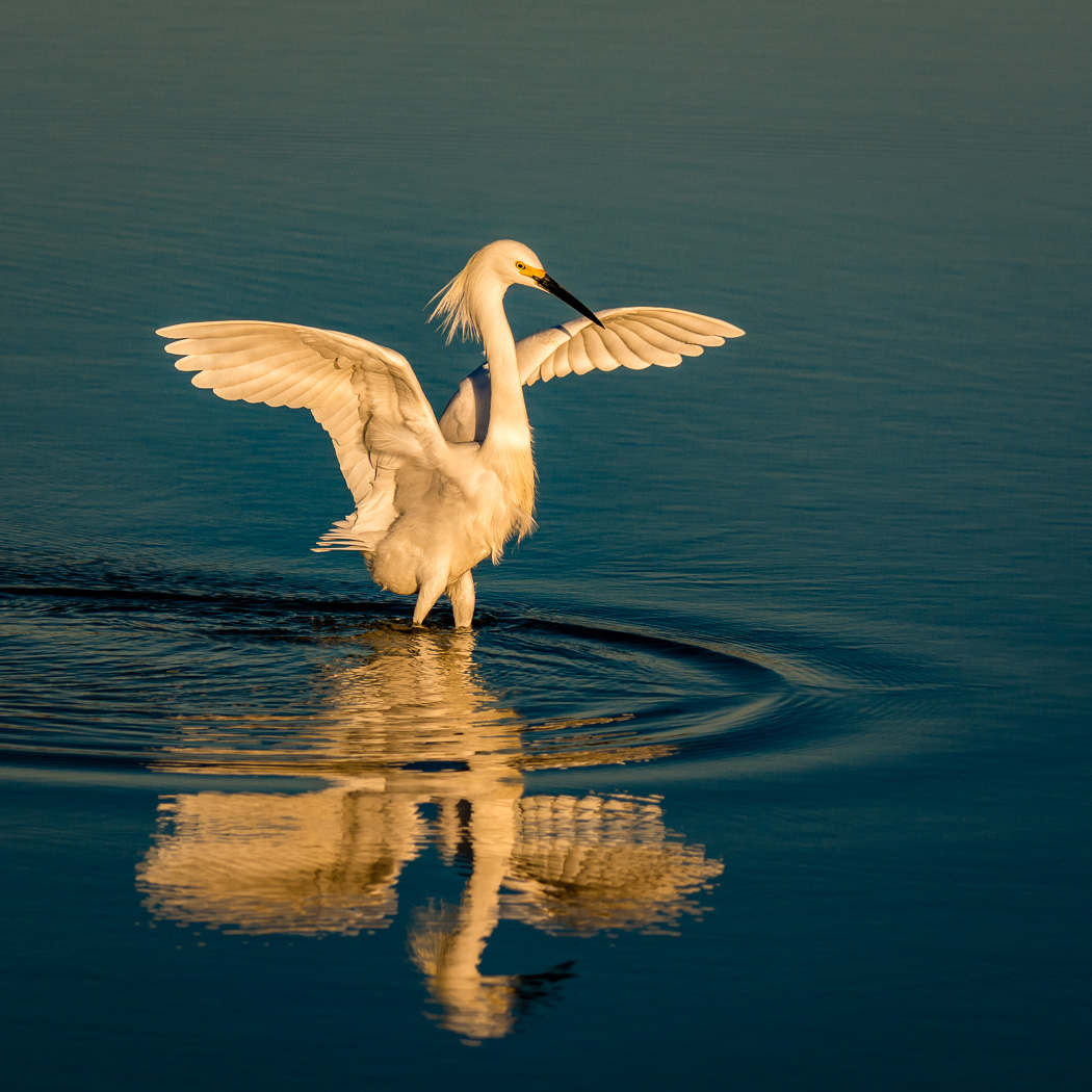 Simple but stunning, this egret landing at sunrise, looking for breakfast