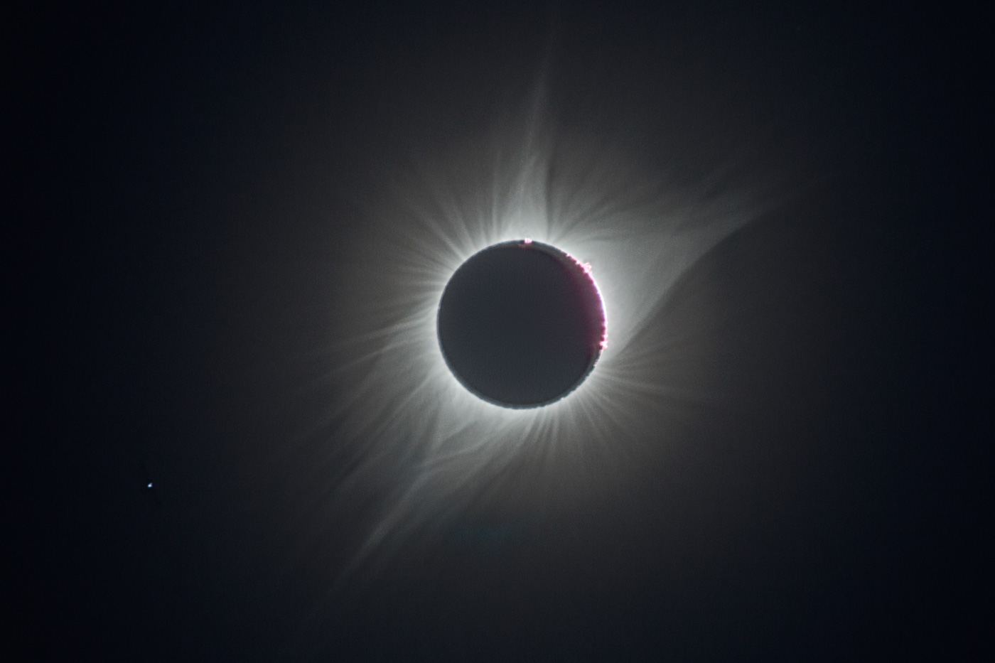 A composite of 7 images using Photomatix Pro and Photoshop. Canon 70D camera with a Tamron 70-300mm zoom at 282mm, f/9. Exposures: 1/1600, 1/500, 1/160, 1/50, 1/15, 1/5, 0.6 seconds. Photomatix Pro to get initial HD image. Then Photoshop to get radial blur for each image, subtracted from each original image. Subtracted images summed with offset to get medium gray background. Then subtracted summed image overlain on the HD image and merged. Regulus is the star at lower left.