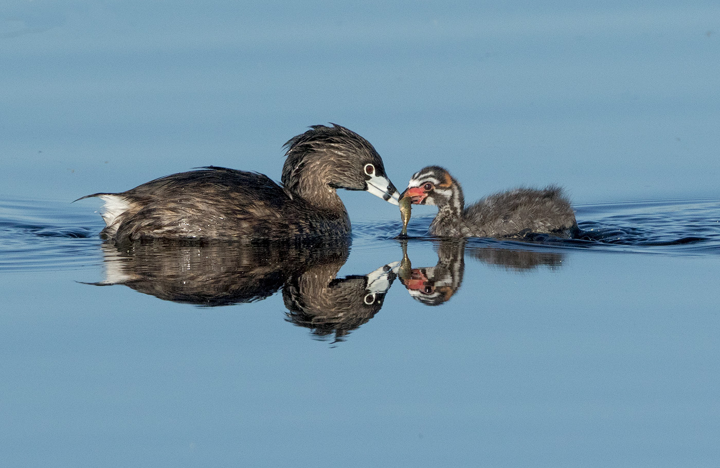 Pied-billed Grebe feeding hungry chick DI3A0455