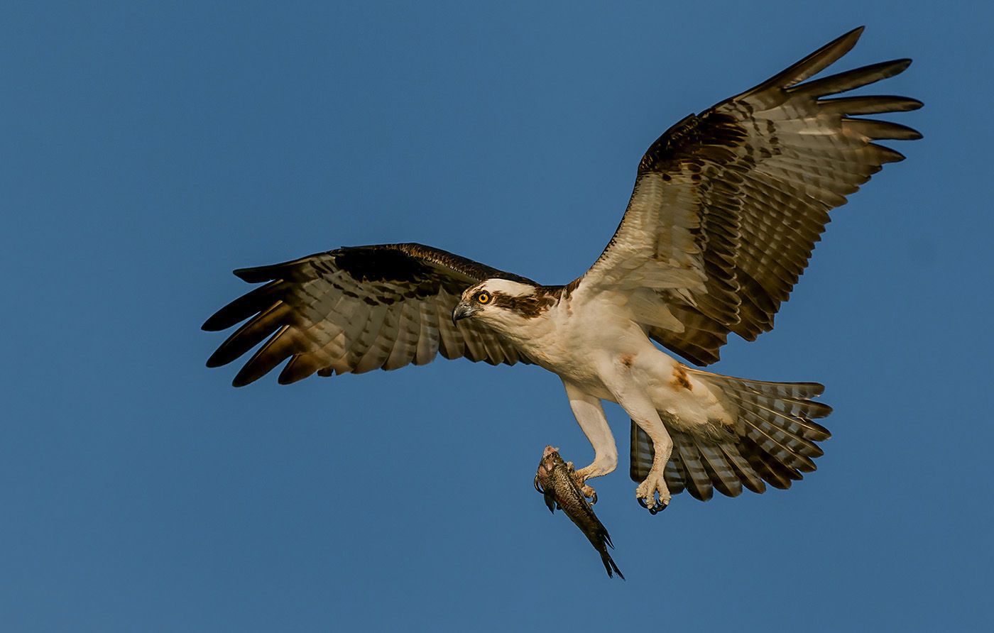 Blue Cypress lake in February. Adult osprey returning to the nest with a fish.