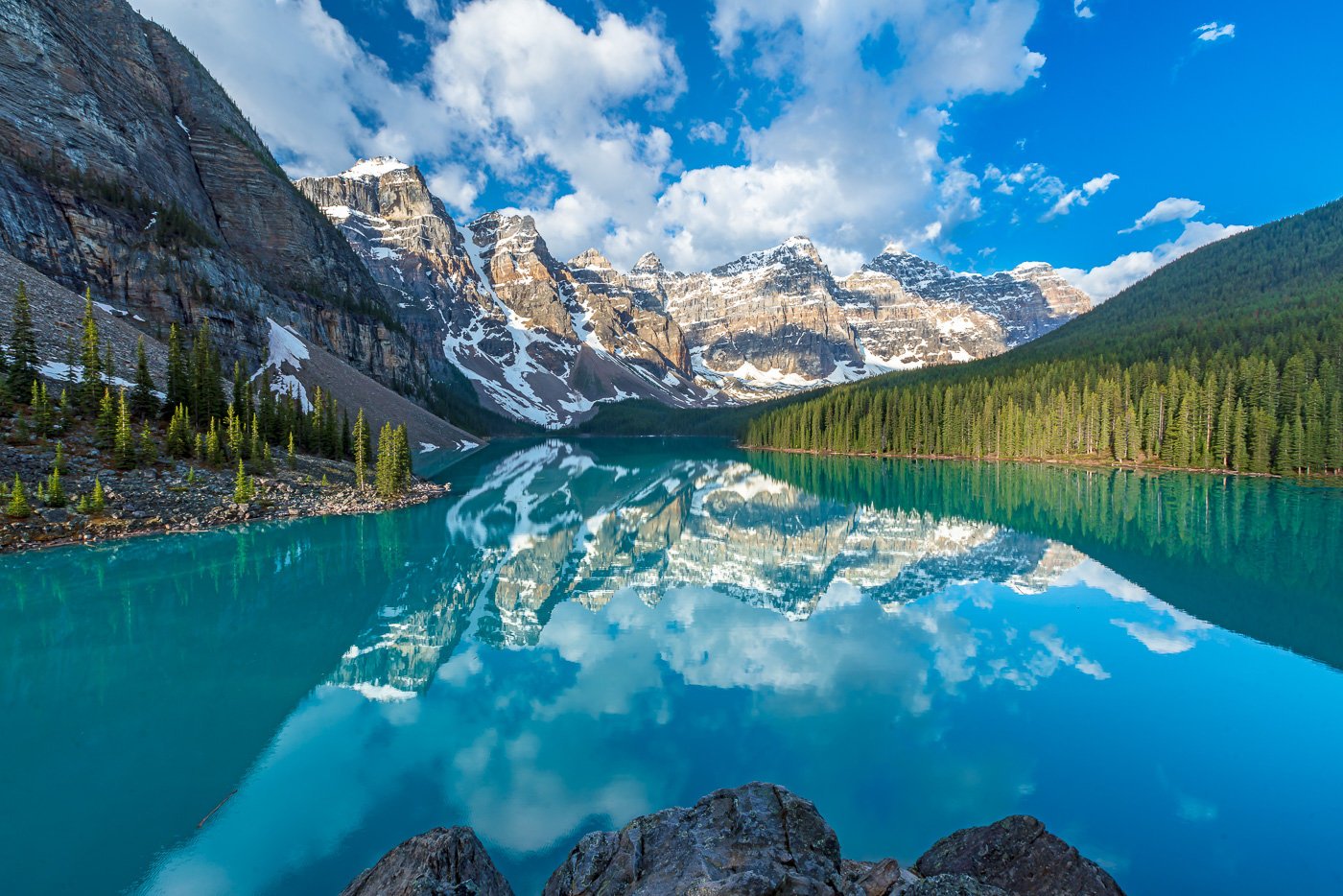 On recent trip to the Canadian rockies went up 3 different times to try and get a perfect reflection of this iconic scene. Weather finally cooperated on the 3rd try with calm water, Blue skies with puffy clouds and good lighting.