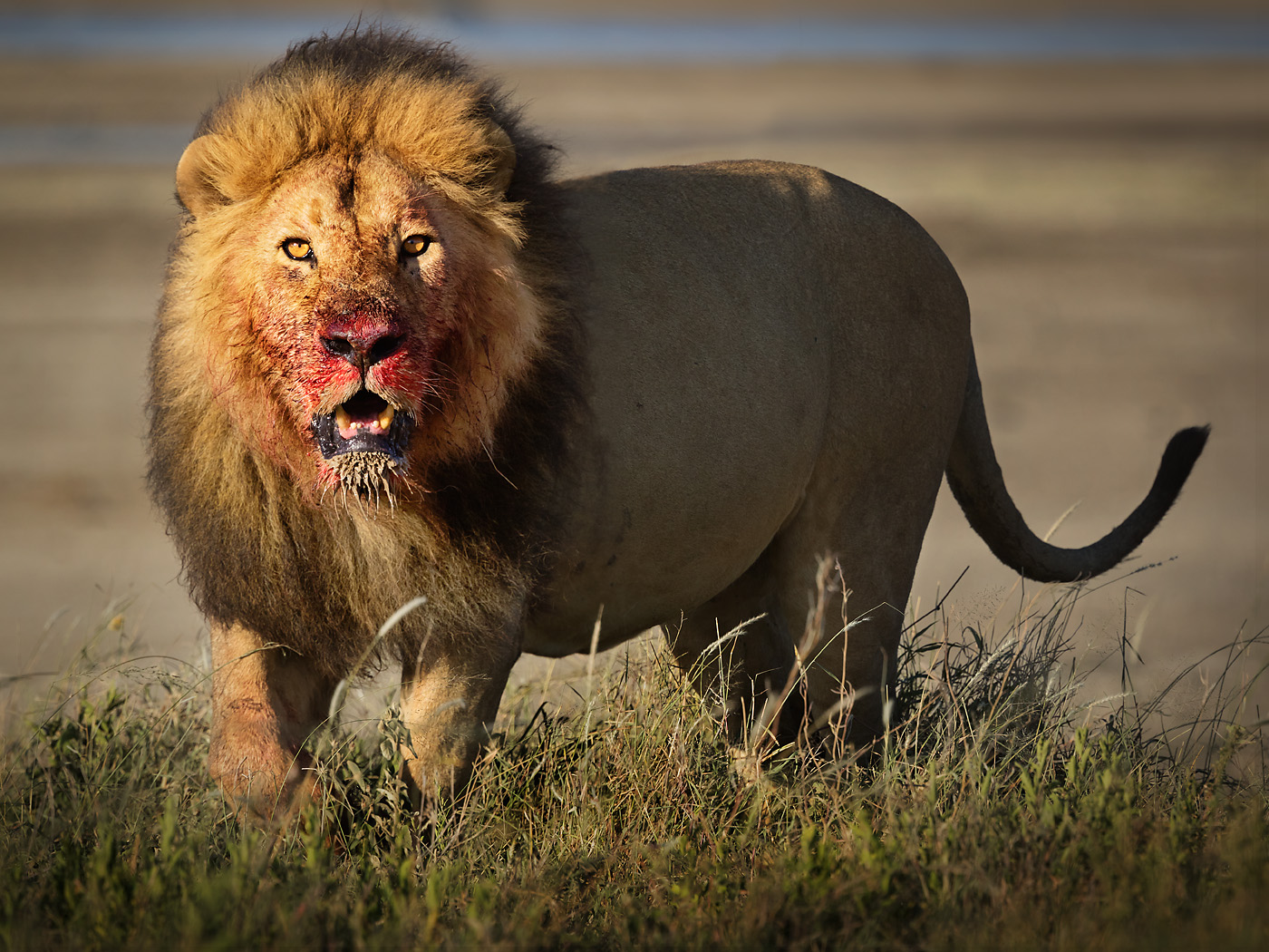 Lion after a breakfast of zebra on the Serengeti. Made with a 300 mm lens; a 2-frame mosaic front to rear for better depth of field.
