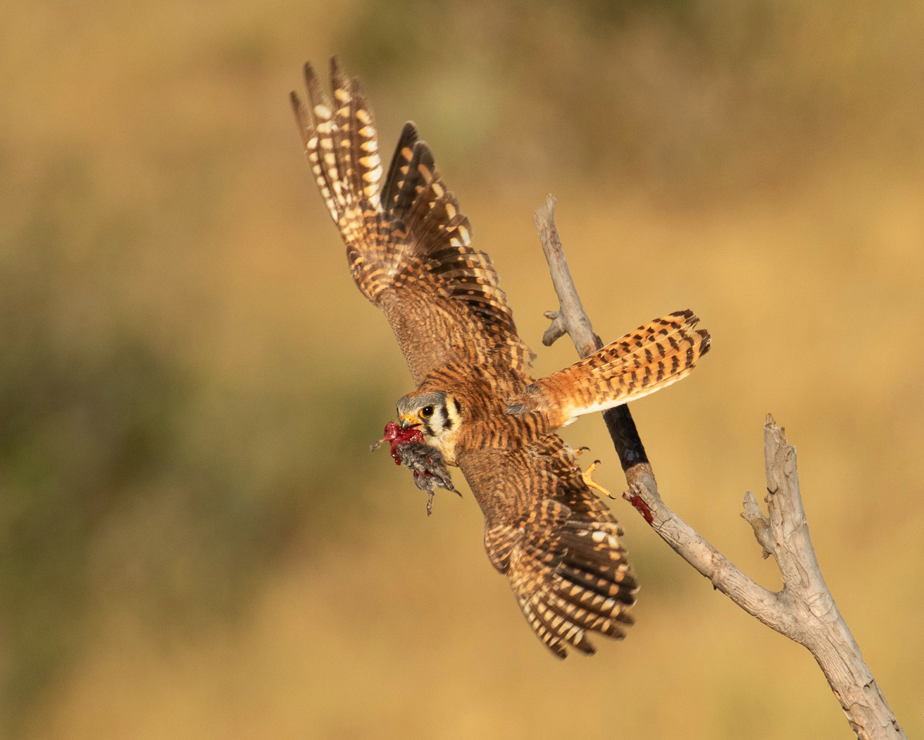 The female American Kestrel landed on a branch near the nesting box to remove the head and intestines before taking the mouse to her chicks for food.