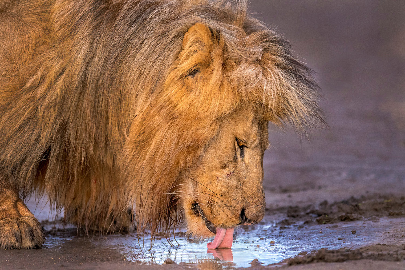 We were headed to my favorite tree for a sunrise shot but we were surprised by a pride of lions. It was a great trade off when this mature male began to drink from a small puddle.