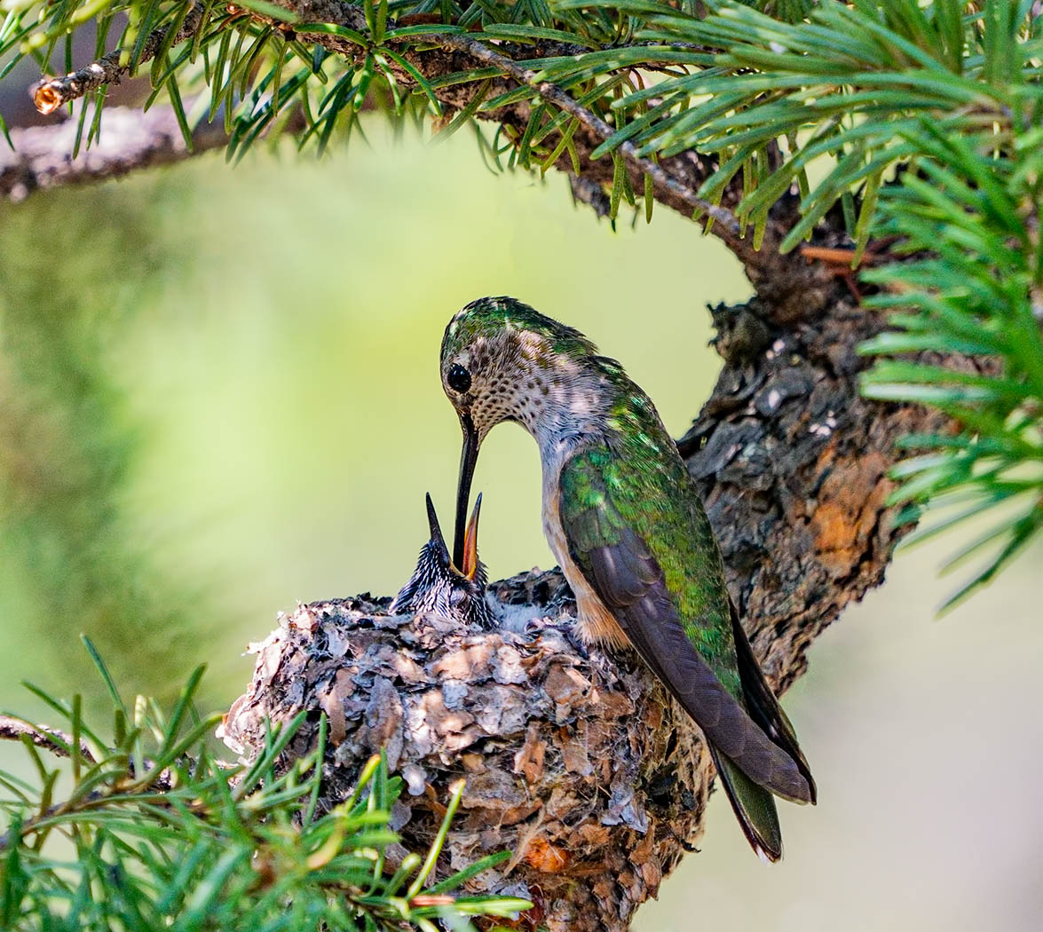 Hungry Hummer - A mother broad-tailed hummingbird feeds its chick. Dillon, Colorado.