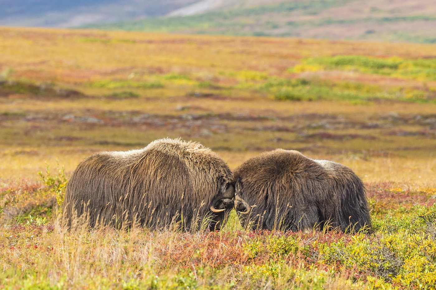 A male and female muskox touch skulls after mating surrounded by the tundra in fall colors near Nome, Alaska.