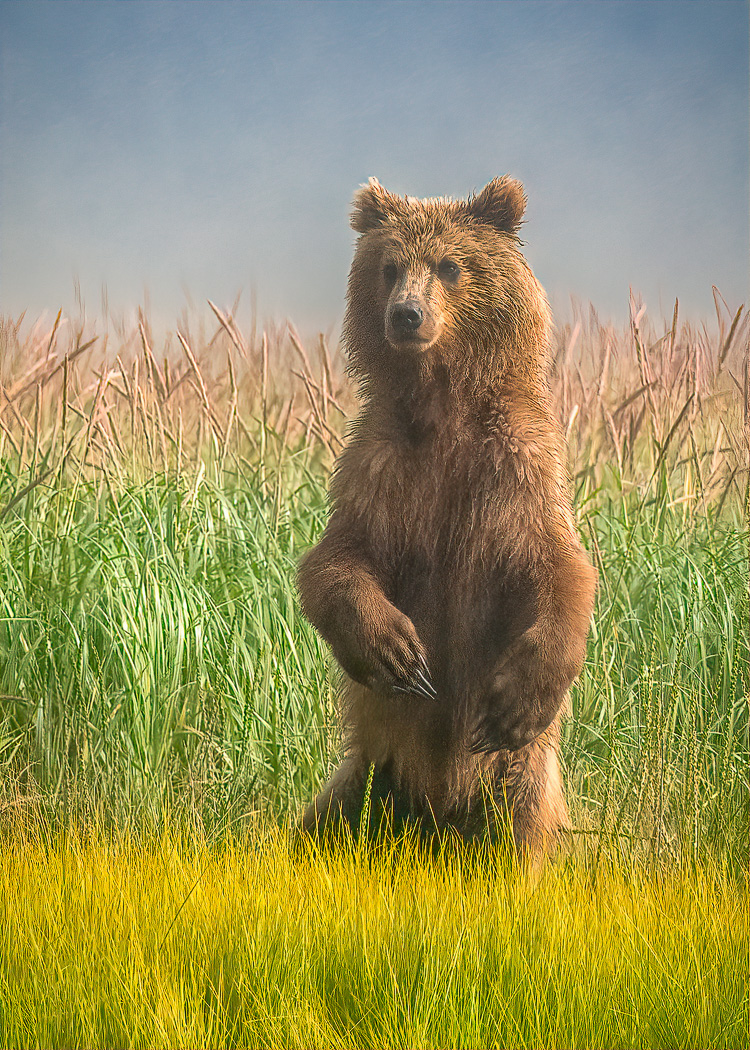 Old sow stands to look over the inlet for sign of fish, getting really tired of grass and berries