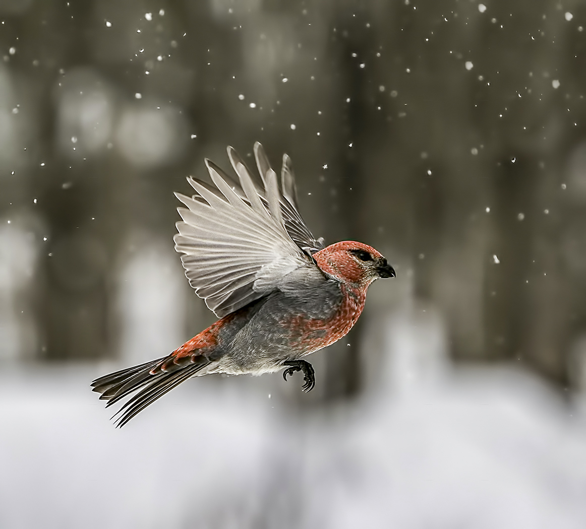 Male Pine Grosbeak Wings Up - A beautiful, male Pine Grosbeak flies in the snowfall. Sax-Zim Bog, Meadowlands, Minnesota.