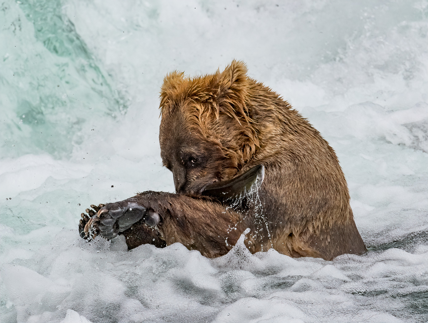 We watched bears of all ages fish and play in the river of Brooks Falls. The younger bears were confined to the lower falls where fishing wasn't so easy. This young bear with sad eyes was quite pitiful as he missed his catch over and over again. Thinking he would never catch his lunch while I watched, he finally grasped this fish, struggling to maintain his slippery hold. His eyes seem to be saying, "pretty please - let me keep this one". "I'm so hungry".