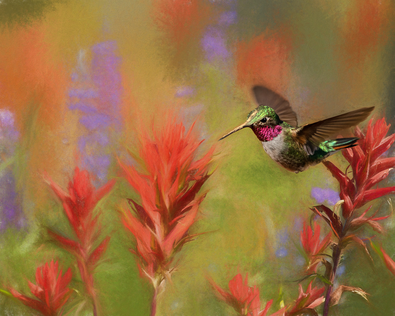 The background of this image is digitally painted with the hummingbird superimposed as shot straight from the camera.