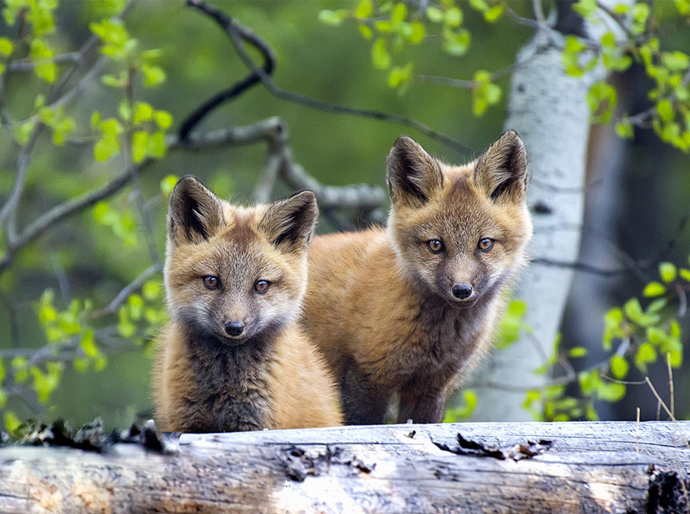 A pair of fox kits posing for a portrait.