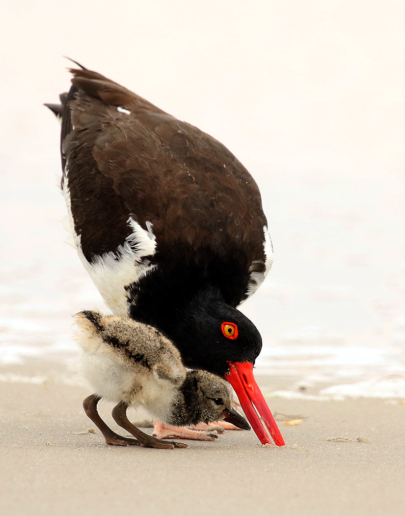 A male Oystercatcher feeds his young chick