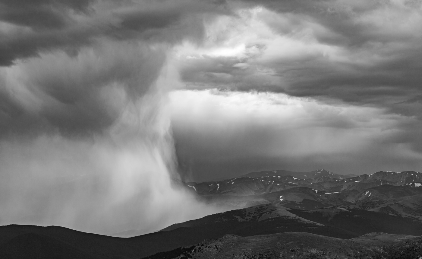 A late summer storm pounds the mountains around Mt. Evans. I love the drama of the shafts of water pouring out of the boiling cumulous.