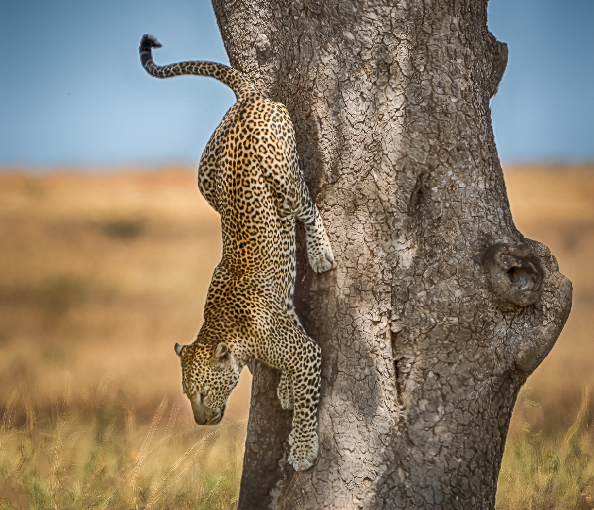 This leopard was resting in a tree when he saw some gazelles in the distance. He bolted down the tree to go take a closer look.