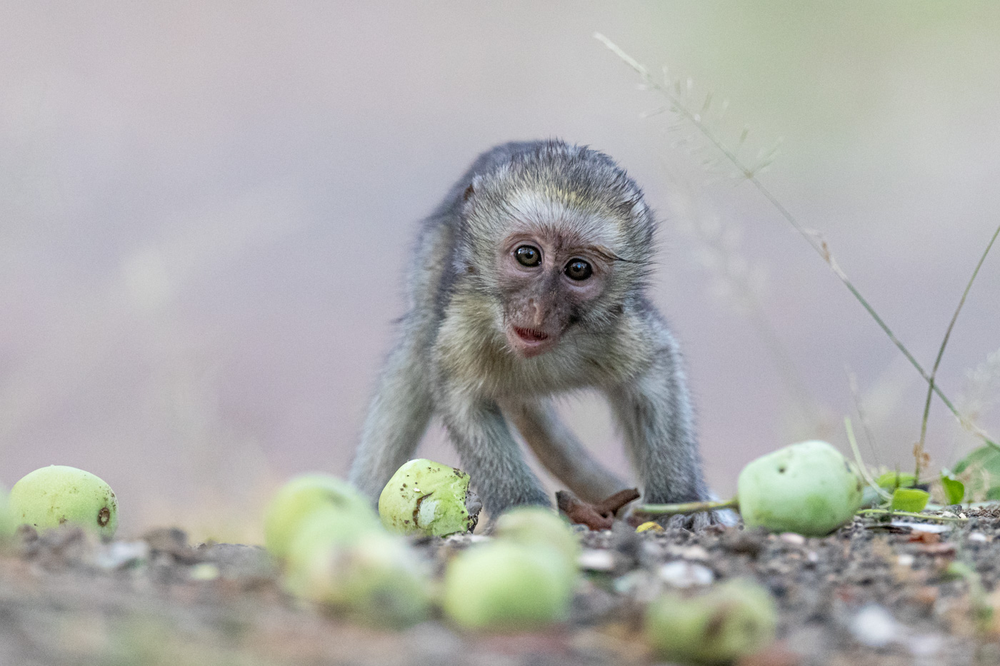 Baby Vervet Monkey playing with ripe Marula Fruit