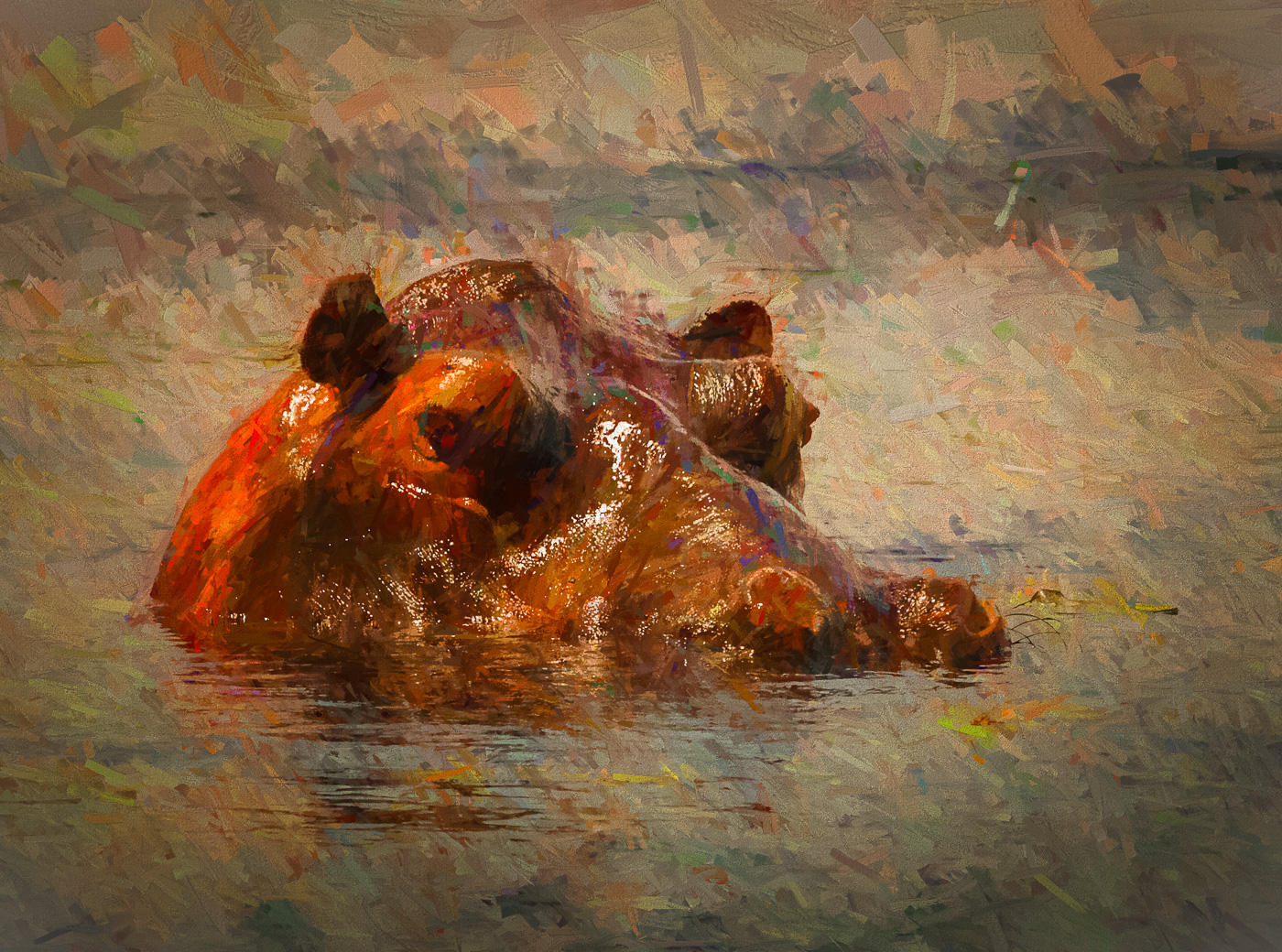 The hippo already looked sun-burned. I grossly enhanced the reds and oranges in LR, then Impressionized the image in Topaz, accentuating the brush strokes, amount of "paint" on the brush, and stroke angles, then finished back in NIK suite.