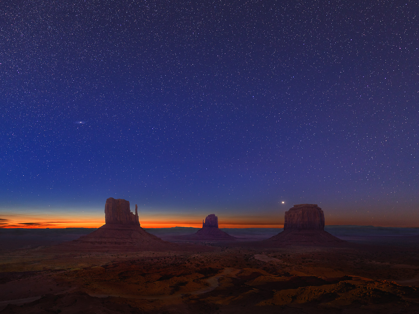 In deep twilight (May 2014) dawn was starting but stars were still visible. Venus is the brightest here. Also see the Andromeda Galaxy on the left. More info at: