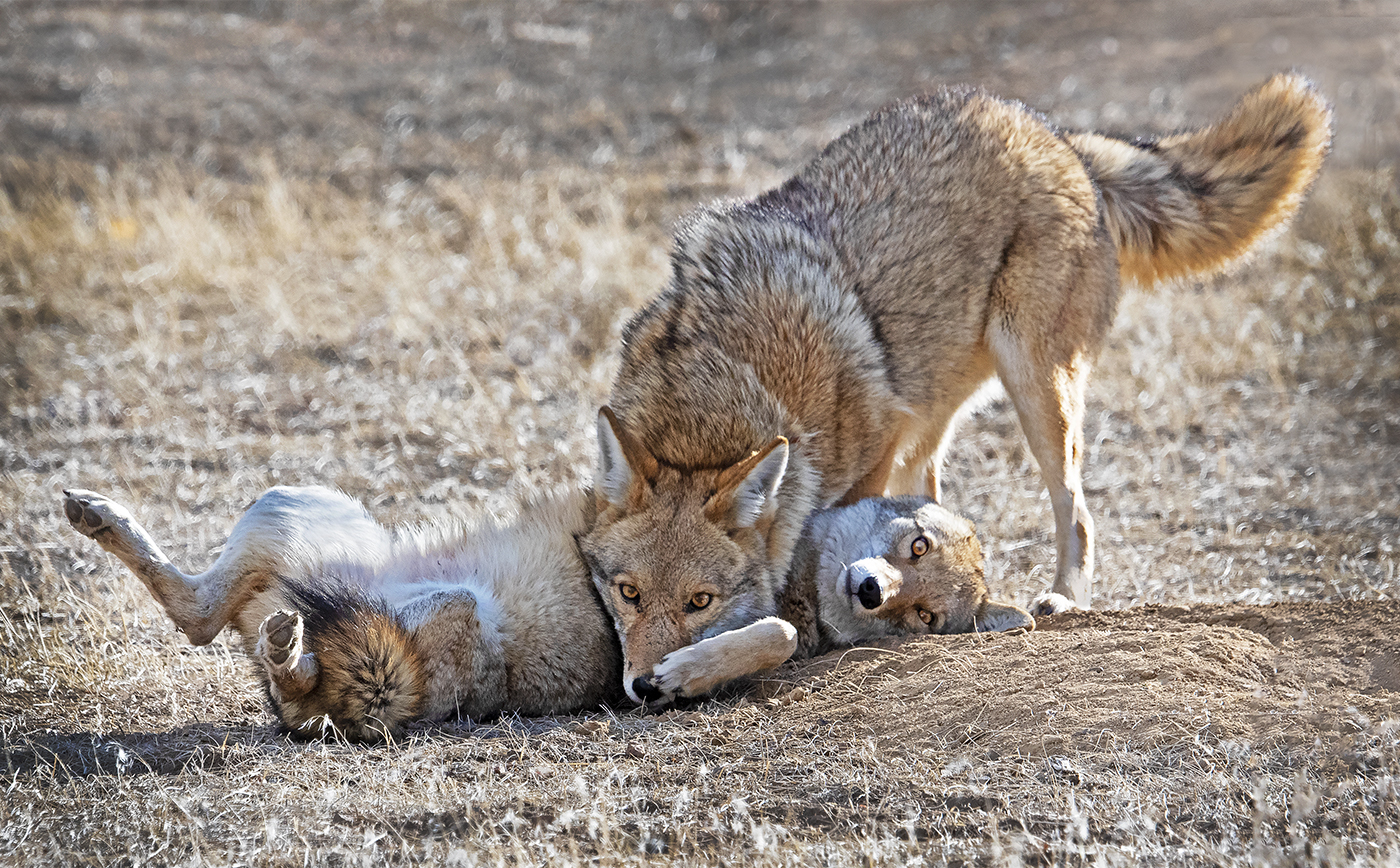 Two coyotes entertaining themselves while hovering over a prairie dog hole.