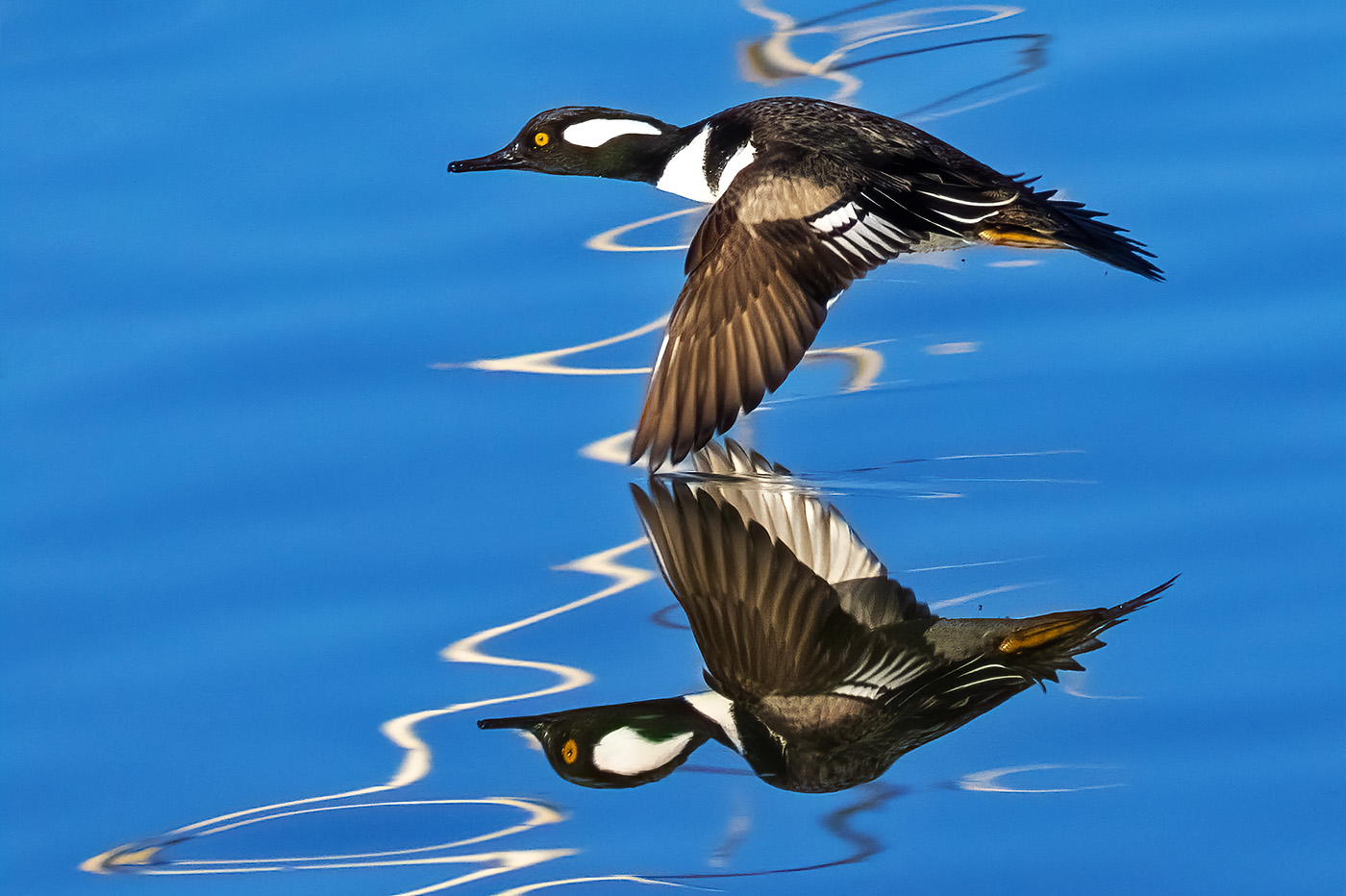Hooded Merganser skimming across Kountze Lake in Belmar Park. Diagonal reflection of tree.