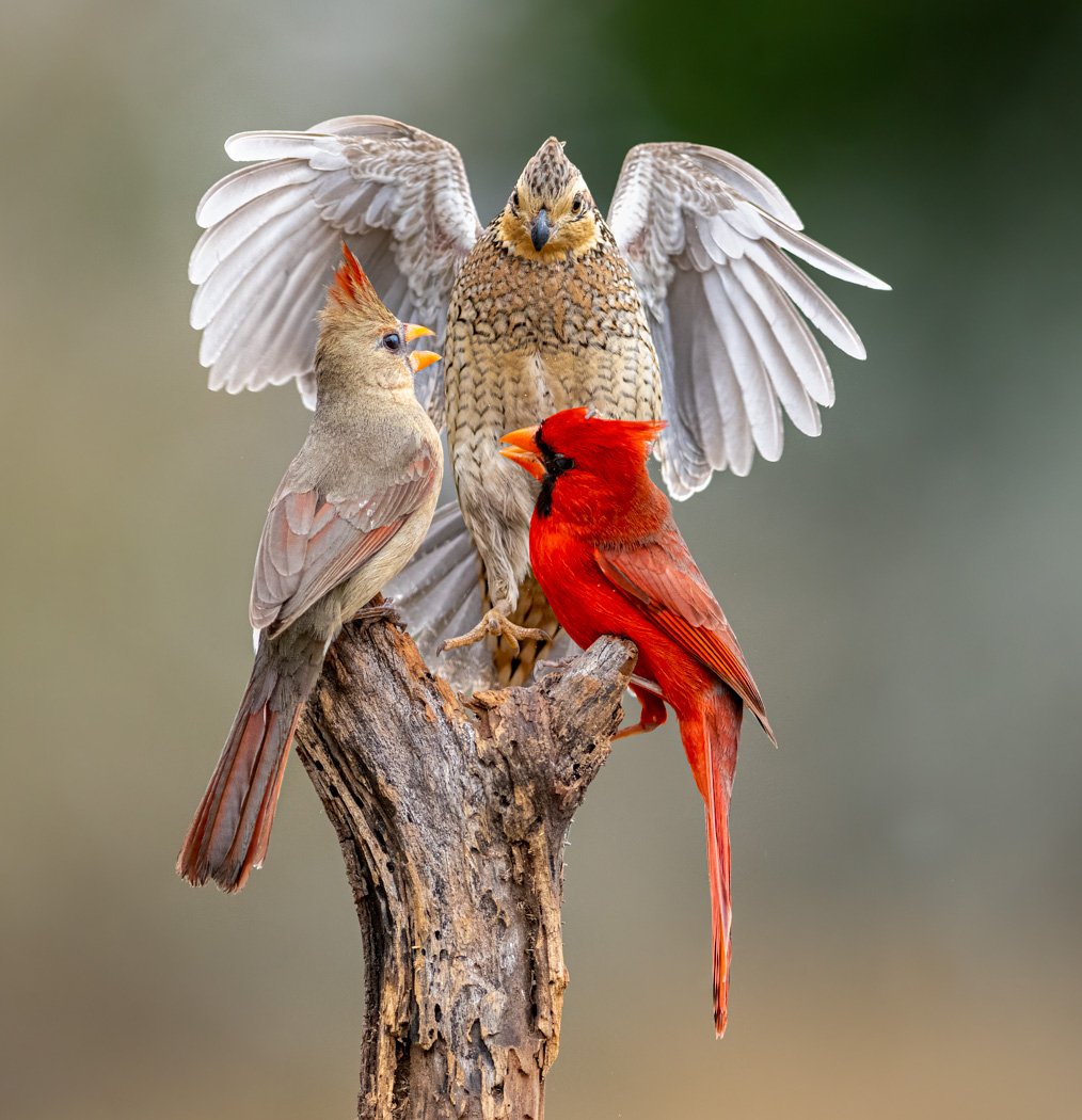 Female Northern Bobwhite Quail and a Male and Female Northern Cardinal