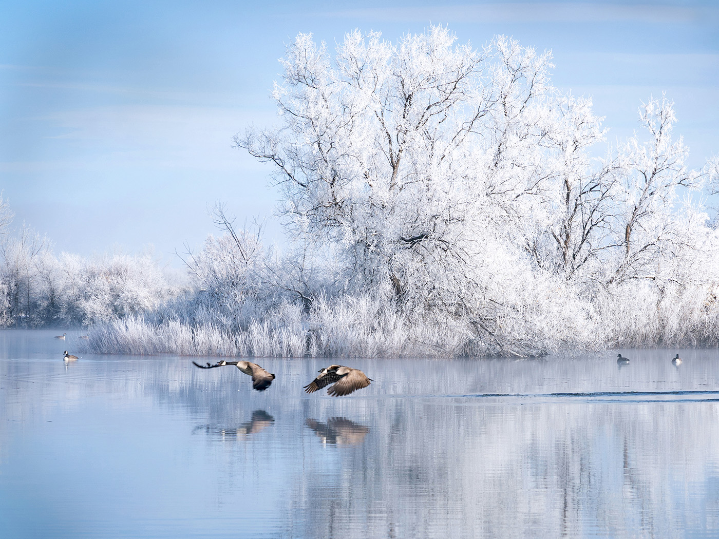 Hoar frost in trees with geese