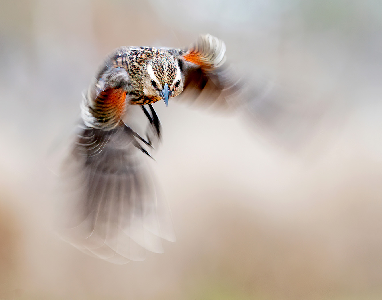 In the late afternoon, dark clouds came in, making it impossible to use a fast shutter speed, so I opted for a slow one and was rewarded with this capture as the bird hovered for a second.