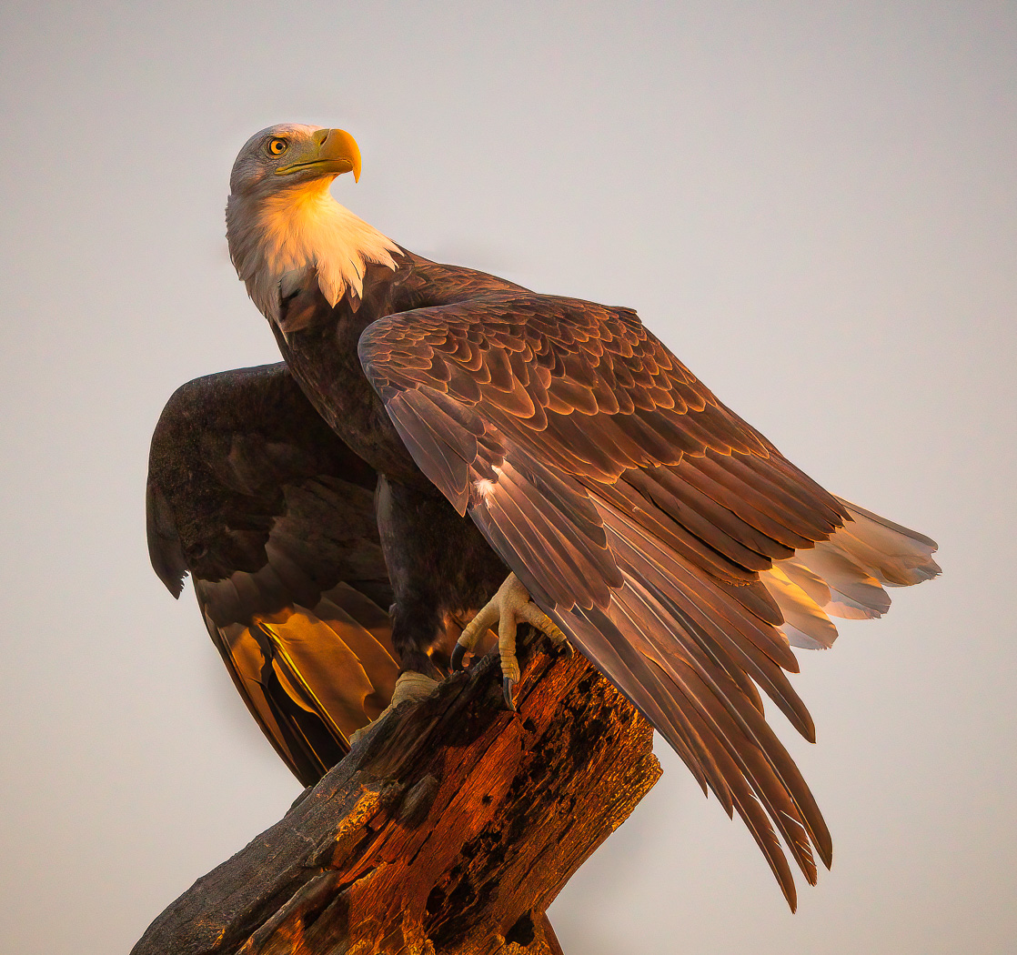 A bald eagle lands on a stump and strikes a pose in early morning light at Chatfield