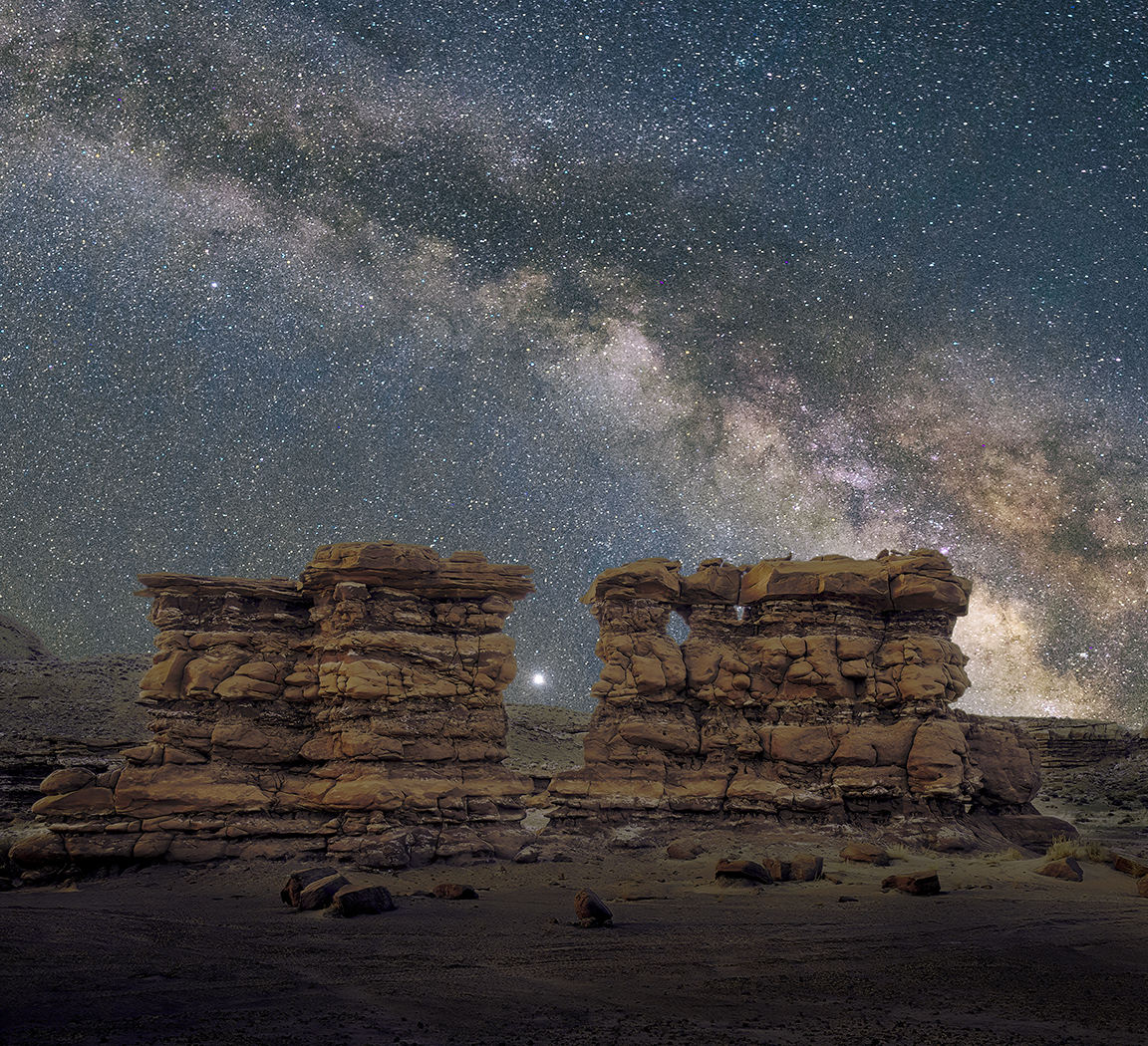 This is a composite of a hoodoo structure outside Bluff Utah with a milky way sky added to the picture. Compositing was done in Photoshop