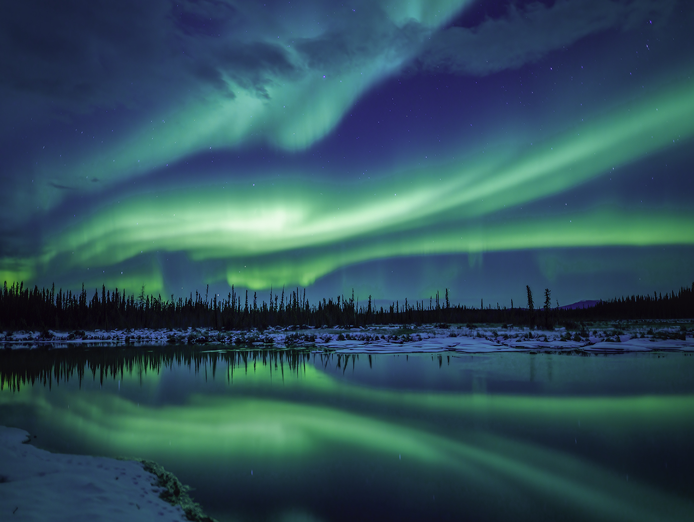 A reflection of the Aurora into a pond taken outside of Fairbanks near Delta Junction Alaska.