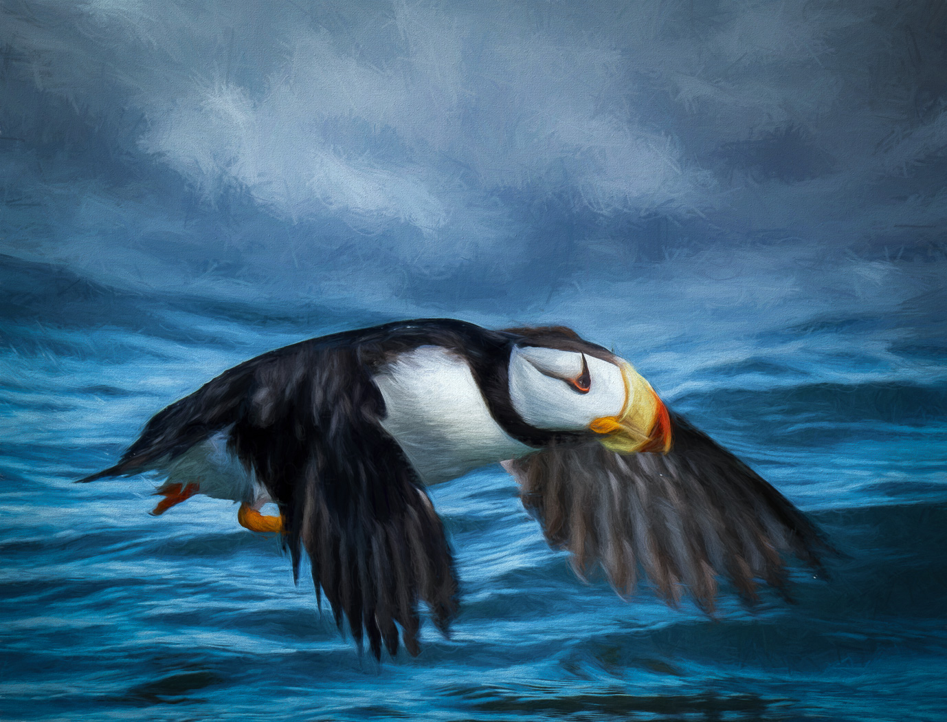 I loved the original image of a puffin flying against big waves, but it is just slightly blurred, more than I can fix. I decided to increase the color saturation, then take it into PHotoshop and use sky replacement to replace the seas with stormy clouds. What resulted as to replace the upper half of the image with stormy clouds, but the waves at the bottom remained. I then ran it through Topaz Impression and created a painterly look, and, once I had that, I repeated it again entire second run through Impression, this time focusing on the brush strokes, width, length, amount of paint per stroke. then back to Lightroom to work on tonal values and vibrance and...voila! Now I hope you won't notice that the original bird picture was blurred!
