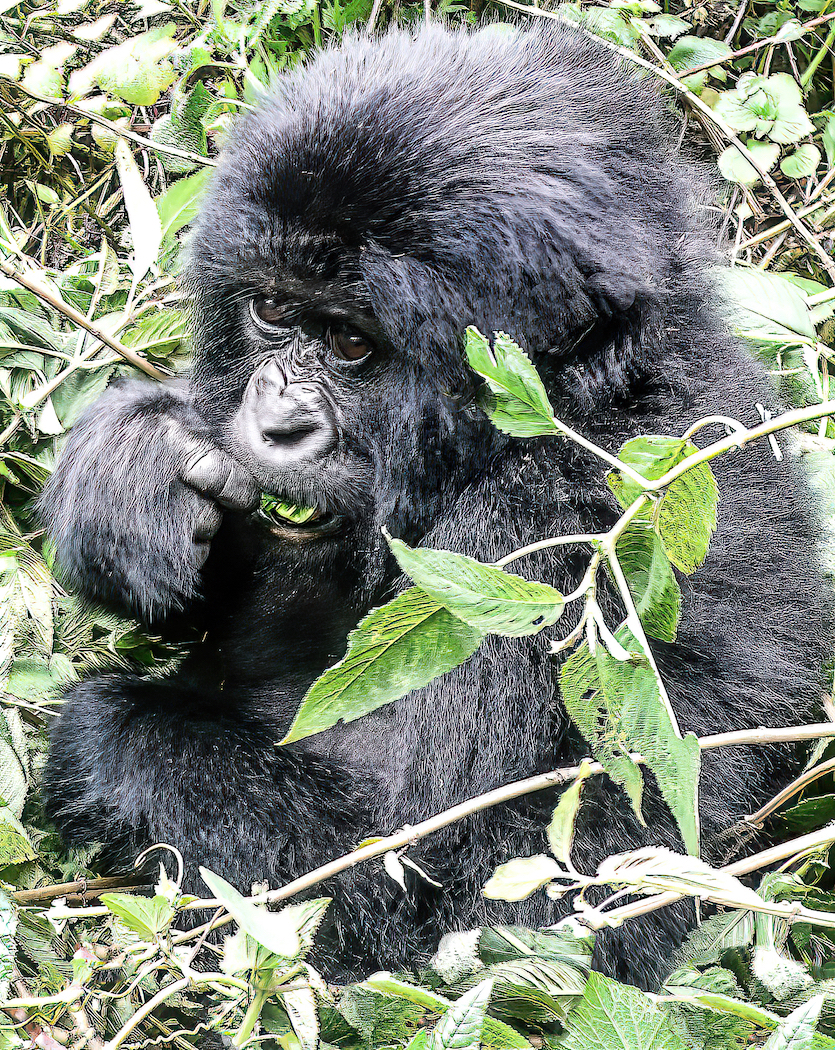 This little one walked up behind me and sat down. I had to move slowly away to get this shot. The mama gorilla was somewhere out of sight, but I was sure she was watching. Probably the most nerve racking photo I've taken. The guide was beside me talking to the gorillas and helped me move into position to get the shot.