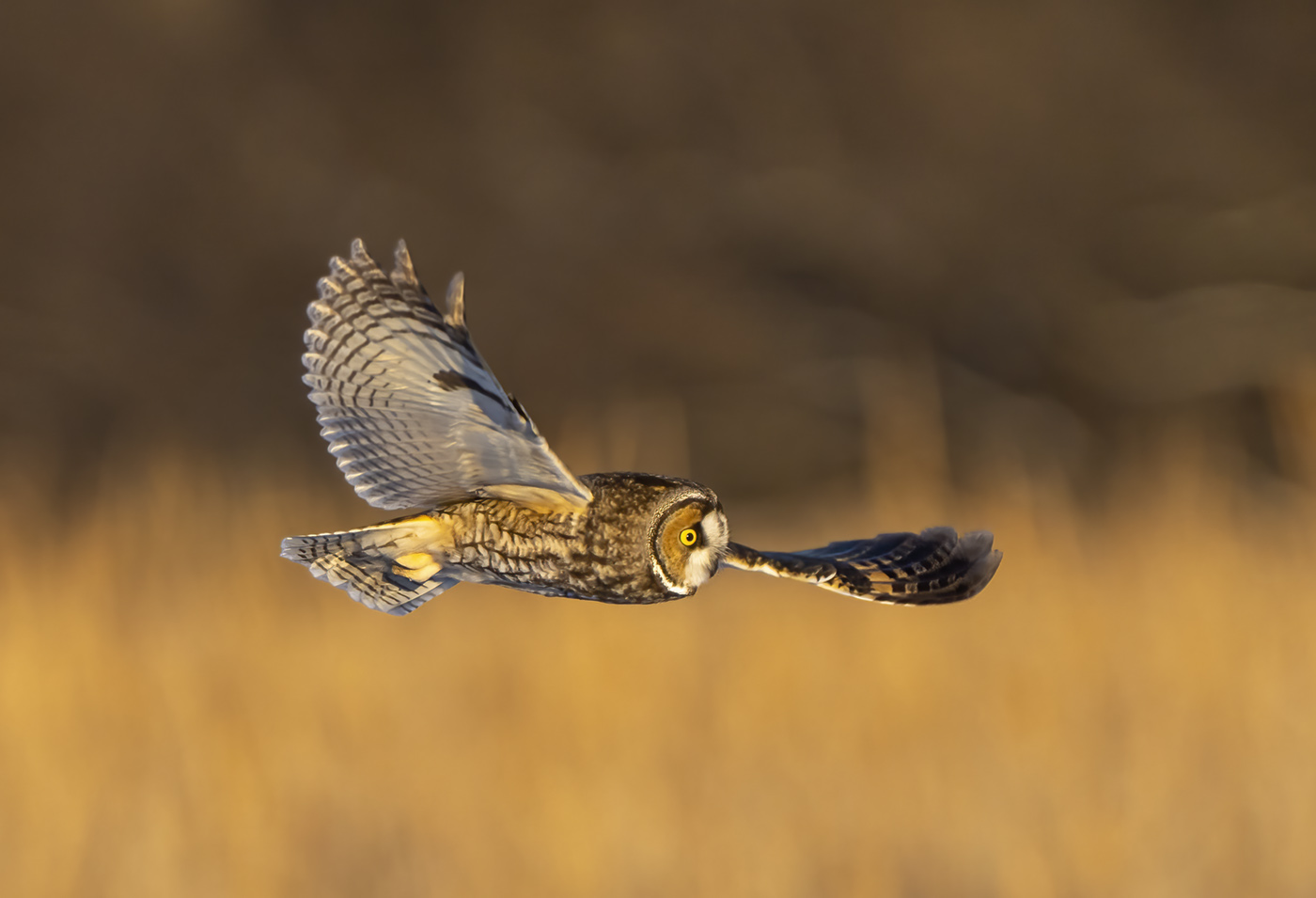A Long-Eared owl cruises the open fields at sunset in search of voles.