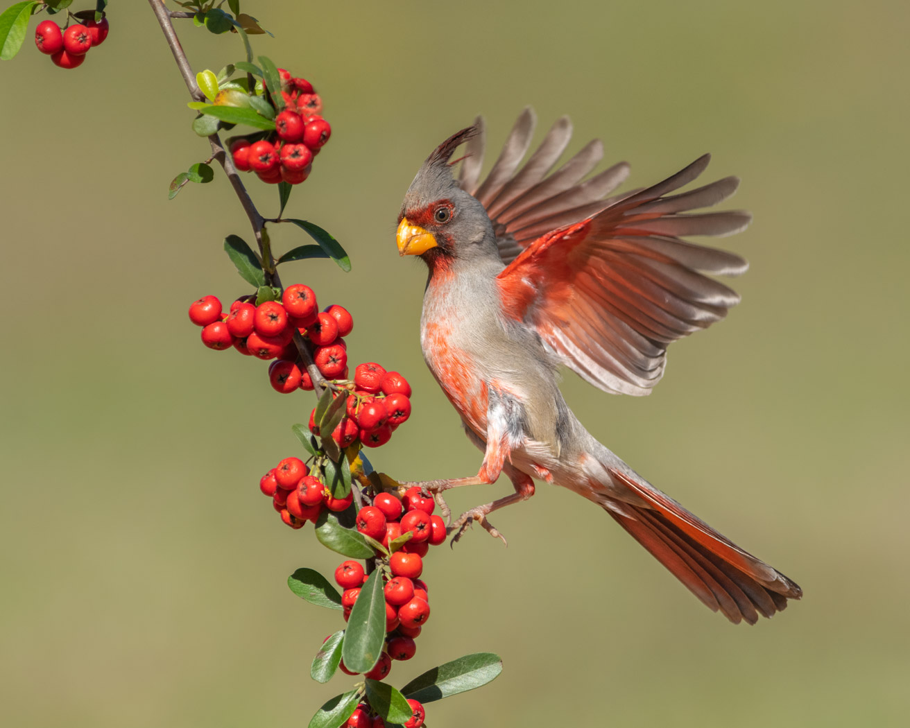 This is a Male Pyrrhuloxia. This year is the most Pyrrhuloxias that we've seen in a long time. They are generally fairly docile, but can be aggressive at times. They are a strikingly beautiful bird.