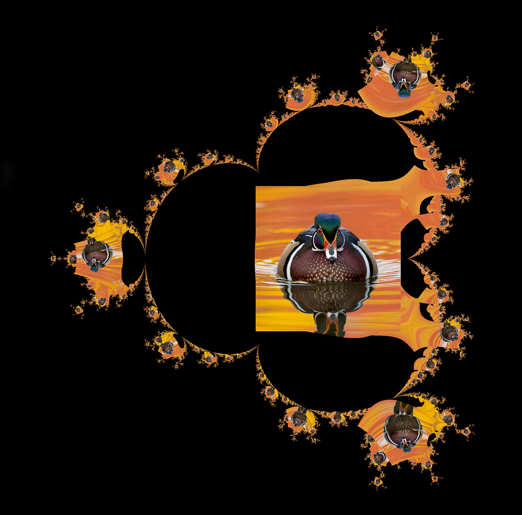 To create this I converted an image to a 2D Julia set, altering the degree of the polynomial and orbital trap size then that image is run through a Mandelbrot Fractal creation tool.
