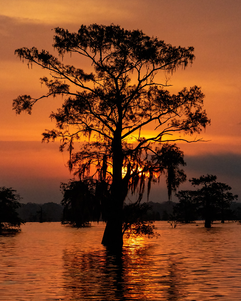 Sunrise behind a Spanish moss-covered tree in the Atchafalaya Bayou.