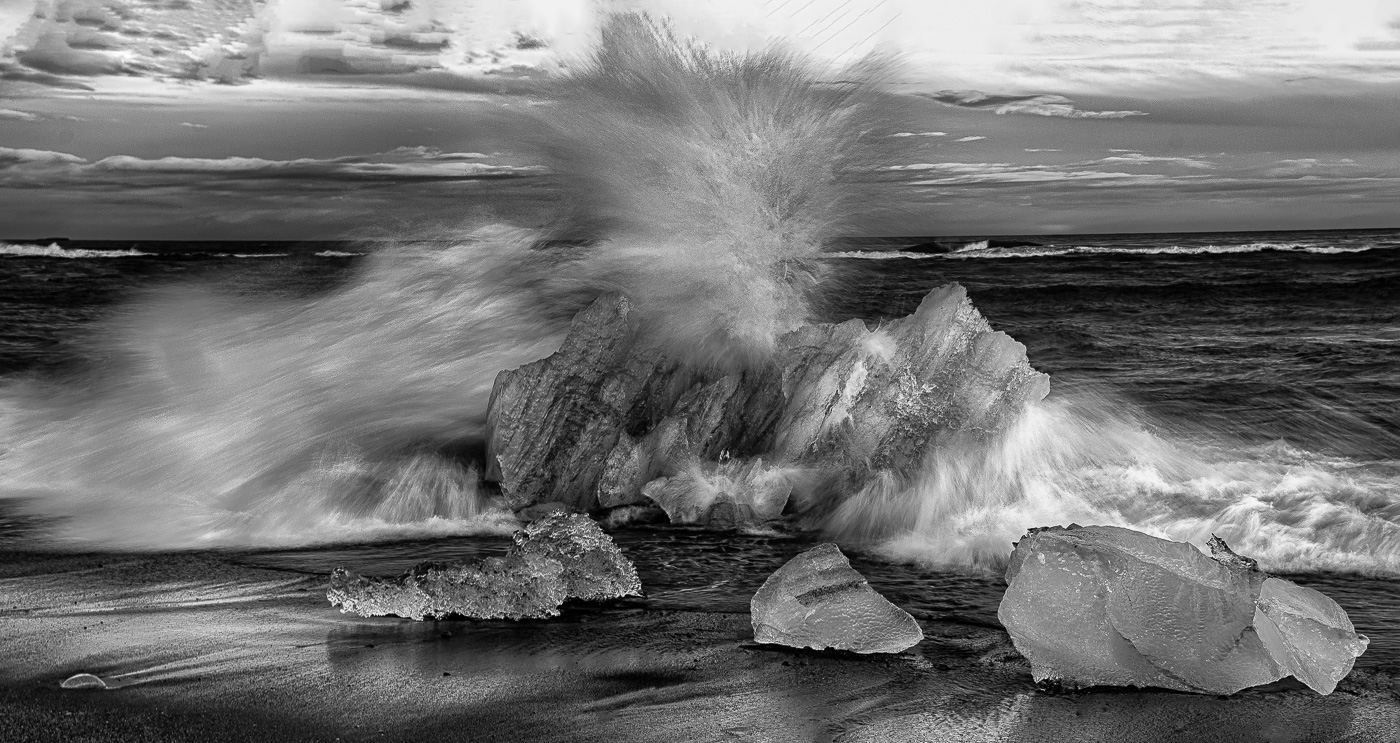 It was a cloudy windy afternoon with waves crashing on the shore as well as on the ice structures at Black Diamond Beach.